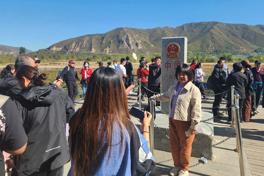 ‘87’거리의 가장 중요한 일경인 87호 경계비앞에서 기념사진을 남기는 관광객들