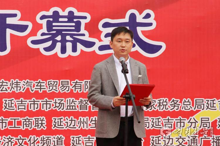 개막식에서 연변굉위자동차무역성 리사장 리위굉이 축사를 하고 있다.