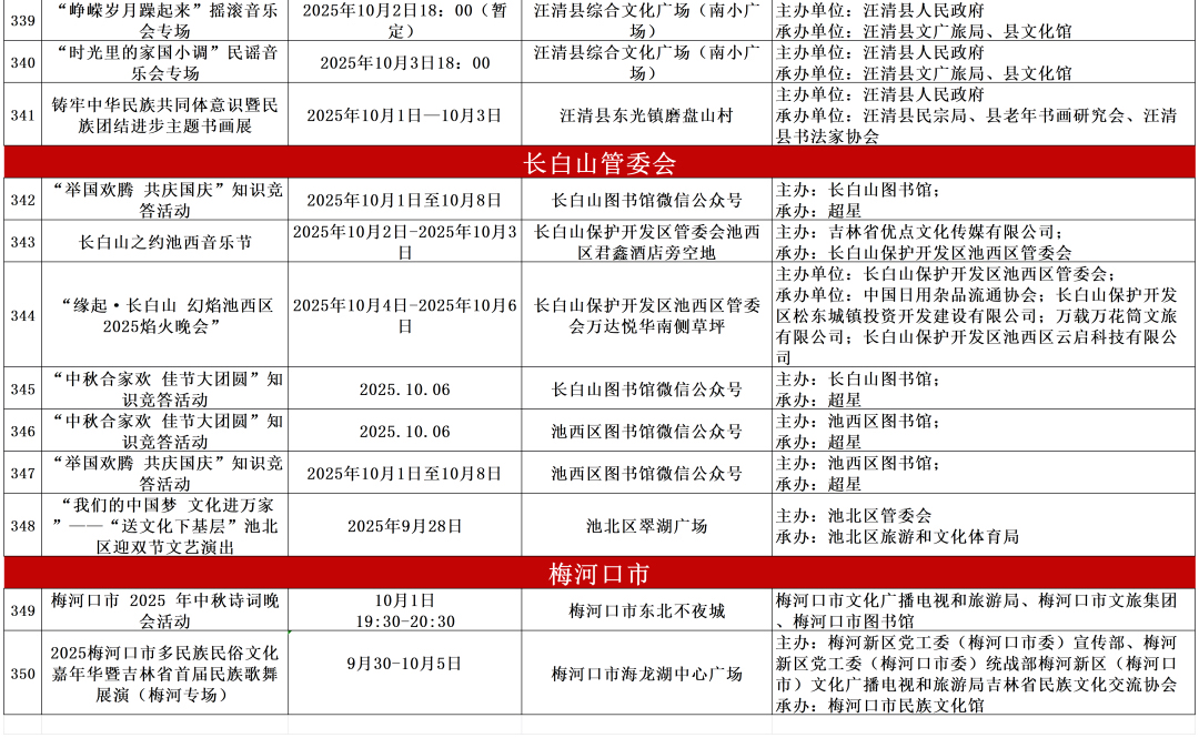 국경절과 추석 련휴를 맞아 길림성에서 다채로운 문화 축제를 마련했다. 전성 각지에서 350여개의 행사가 펼쳐질 예정이며 혜민 공연, 무형문화유산 체험, 서화 전시, 가족 독서 등 다양한 프로그램으로 준비했다.