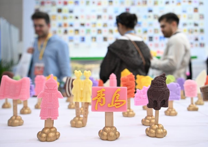 박람회 참가업체 관계자가 다양한 테마의 아이스크림를 선보이고 있다. /신화통신