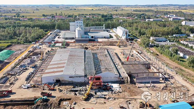 운간육계(耘垦肉鸡) 3산업 융합 대상 현장에서 로동자들이 기존 공장부지 재건축과 신규 공장 부지 기반건설 공사를 질서있게 진행하고 있다.