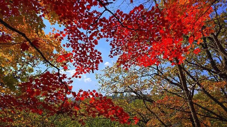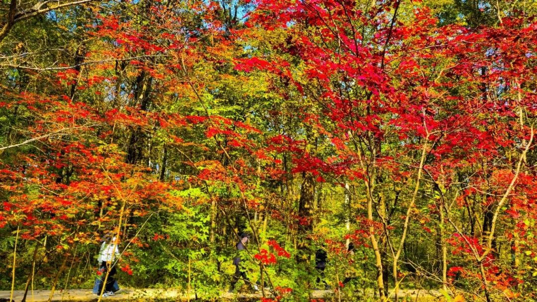 최근 화전 홍석국가삼림공원에 단풍이 붉게 물들어 가을의 아름다운 풍경을 선보이고 있다.