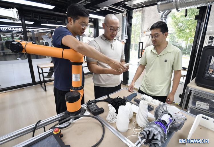 9월 19일, 청년 창업자들이 북경시 봉태(丰台)구에 위치한 기가묘(纪家庙) 쌍창(双创)산업단지의 창의실천 ‘드림팩토리(梦工厂)’에서 신소재 제품을 연구하고 있다. /신화넷