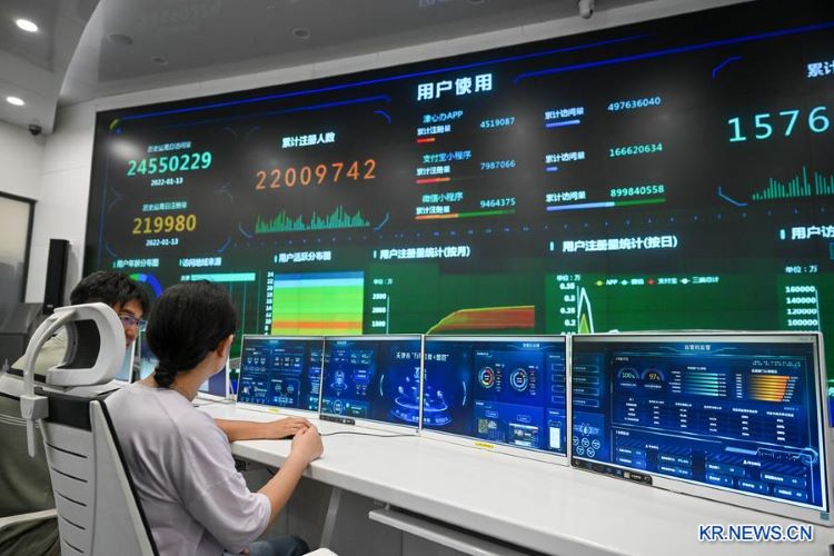 7월 9일, 천진시 데이터발전쎈터에서 작업중인 직원들. /신화넷