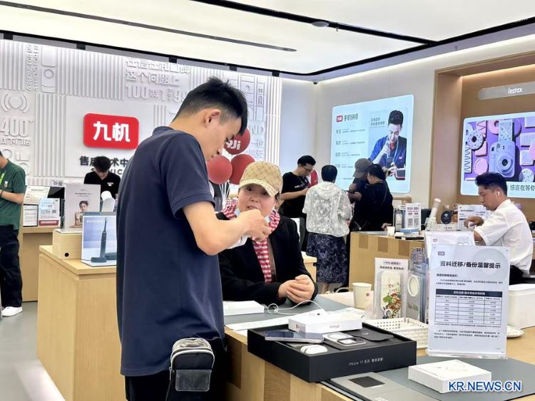 9월 25일, 운남성 곤명시의 한 휴대전화 플래그십 매장에서 직원이 고객의 데이터 전송 및 백업(备份)을 도와주고 있다. /신화넷