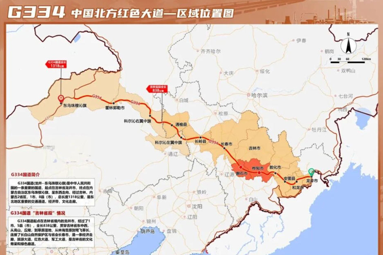 총길이가 1318킬로메터에 달하는 G334 국도는 길림 룡정에서 내몽골 동우짐친기까지 련결되고 길림성 경내에서 895킬로메터 이어진다. 룡정시, 화룡시, 안도현, 돈화시, 화전시, 반석시, 장춘시, 장령현, 호르친좌익중기, 통유현, 훌린고러시, 동우짐친기 등 곳을 거쳐 장백산의 원시림, 송화강반의 물과 산이 어우러진 아름다운 경치 및 연선의 홍색 력사를 련결시킨 G334 국도는 동북지역의 중요한 교통도로와 경제회랑일 뿐만 아니라 홍색기억, 군공정신, 생태경치를 통합한 문화담체이기도 하다.
