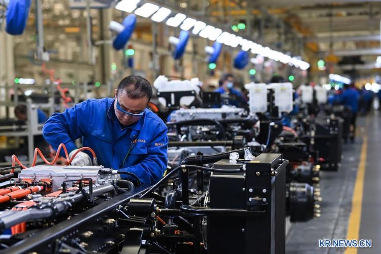 2월 27일, 섬서성 보계시 기산(岐山)현에 위치한 섬서자동차그룹 상용차회사 총조립작업장에서 작업중인 직원들. /신화넷