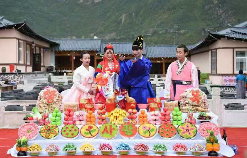 김삿갓민속문화광장에서 한 신혼부부가 조선족 전통 결혼식을 올리고 있다.