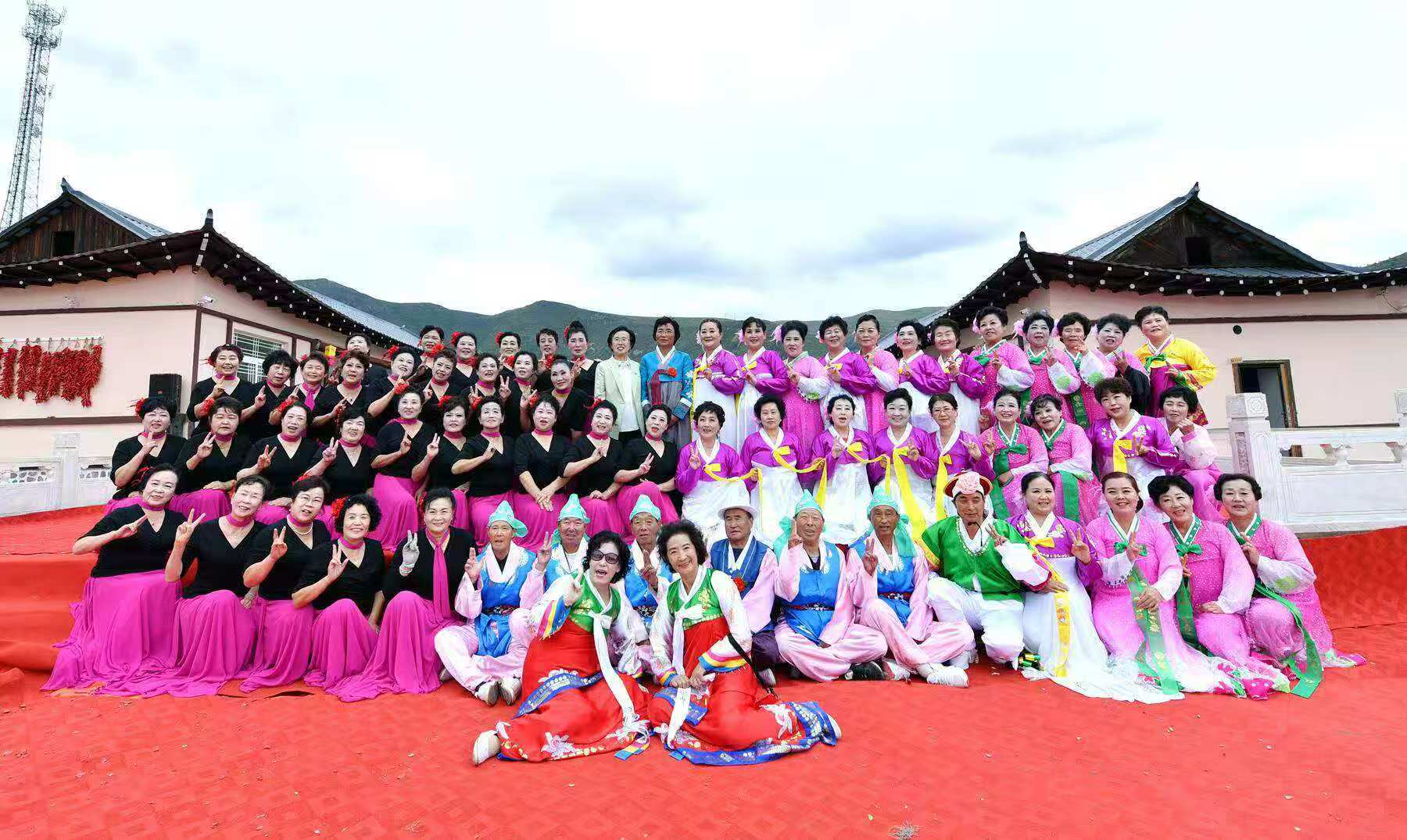 2019년 9월, 김삿갓민속문화광장에서 김명희(뒤줄 가운데)가 장백현조선족로인협회 회원들과 기념사진을 남기고 있다.