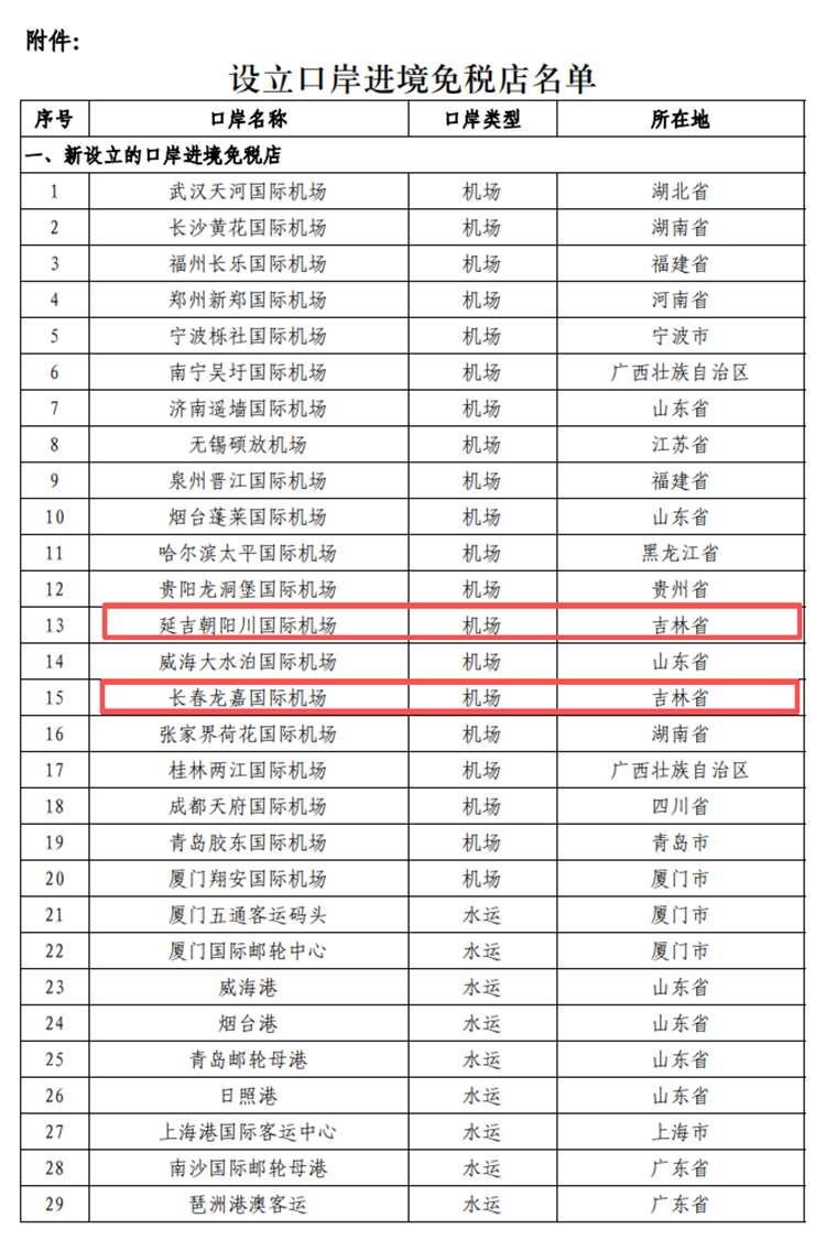 〈통지〉가 전국 41개 통상구에 입경면세점을 신설한다고 대외에 발표한 가운데 길림성의 연길 조양천국제공항, 장춘 룡가국제공항, 훈춘도로통상구 등 3개 면세점이 설립 비준을 받았다. 통상구 입경면세점은 대외에 개방된 공항, 수운 또는 륙로 통상구 격리구역 내에 설립되여 규정에 따라 입경 려객들에게 면세상품을 판매하는 상점이다.
