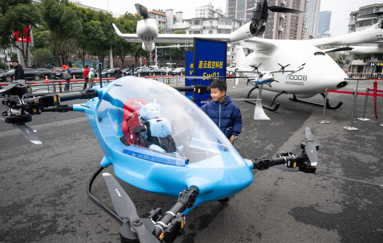 호북성이 자체 개발한 전동수직이착륙기(eVTOL) 항공기와 휴머노이드 로봇이 24일 열린 '중부 지역 중요 전략 거점 건설 가속화 추진 대회'에 등장했다. 현장에는 호북 저고도 경제, 인공지능(AI) 등 산업의 최신 연구개발 성과가 집중 전시됐다. 이날 행사 현장을 찾은 한 어린이가 전시된 eVTOL 항공기를 구경하고 있다.