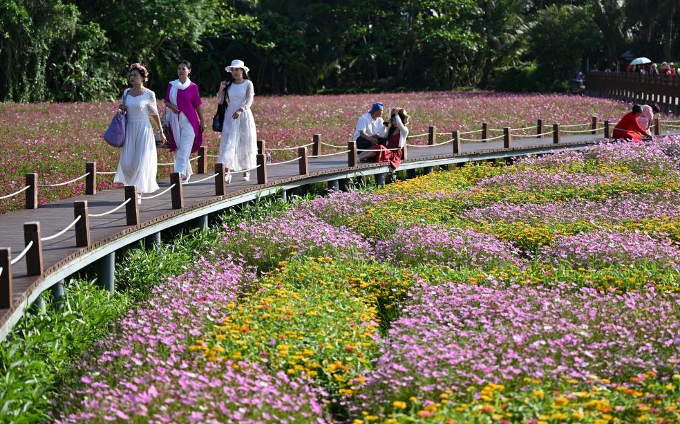 봄이 한창인 해남성 경해시 박오진 남강촌. 수십묘의 꽃밭에 거쌍화(格桑花), 코스모스, 황화국화가 만개한 가운데 3월 24일부터 27일까지 열리는 박오아시아포럼 2026년 년회를 맞이하고 있다.