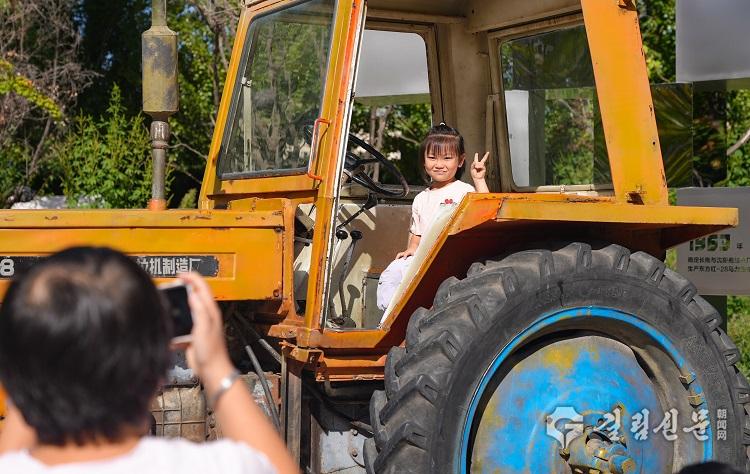 농민들에게 인기가 많았던 스타 제품 장춘-28형 다용도 뜨락또르와 사진을 찍고 있는 어린이.