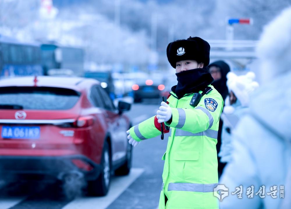관광지주변의 교통을 지휘하고 있는 녀성 경찰.