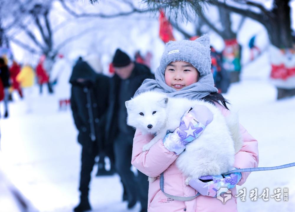 꼬마가 흰여우를 안고 기념사진을 남기고 있다.