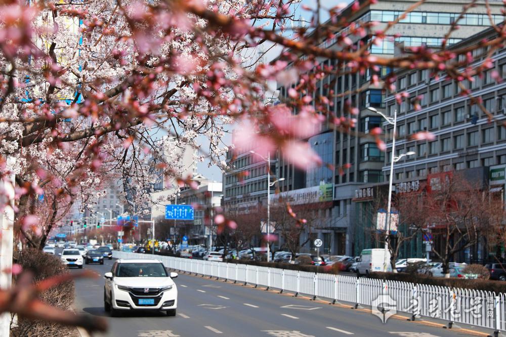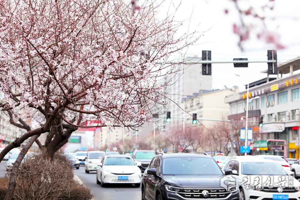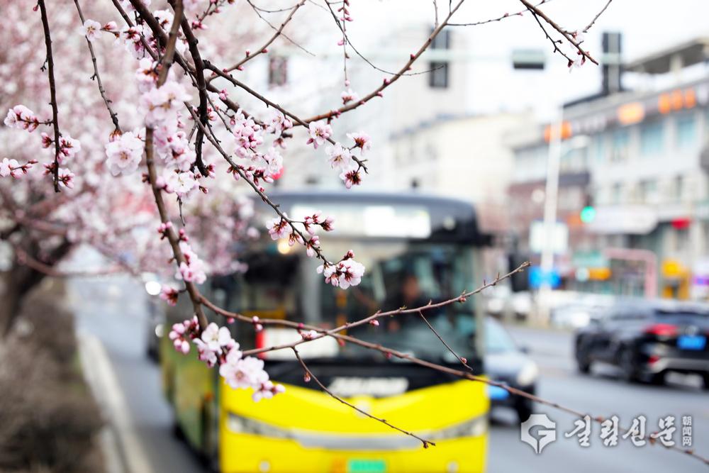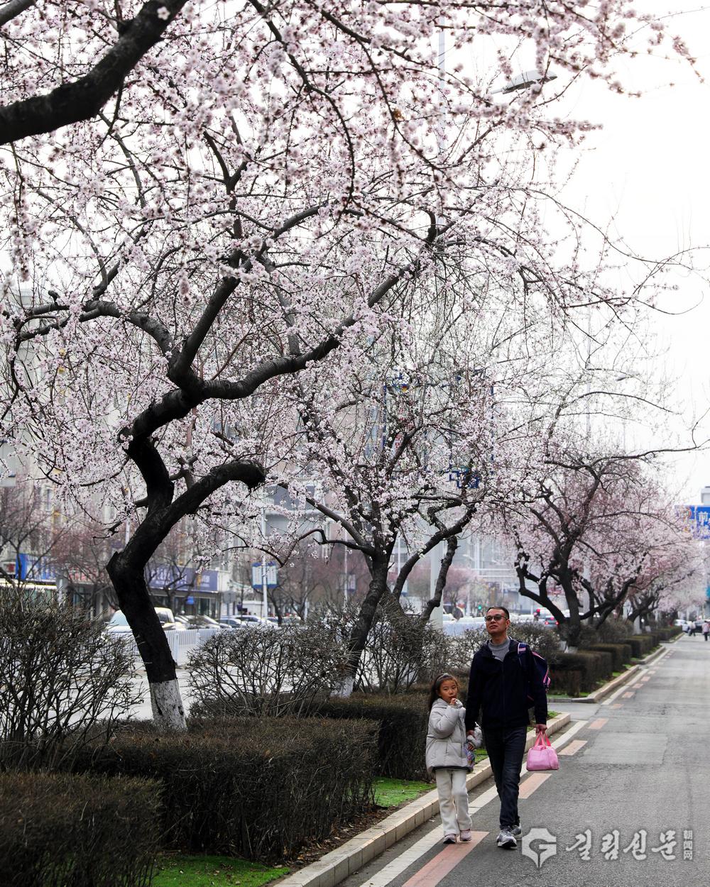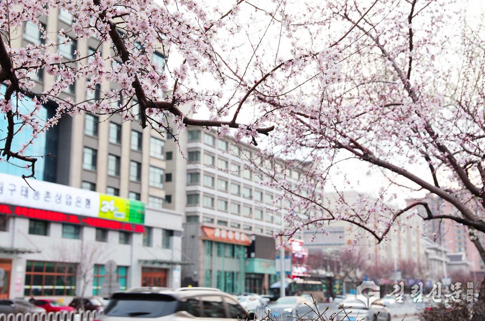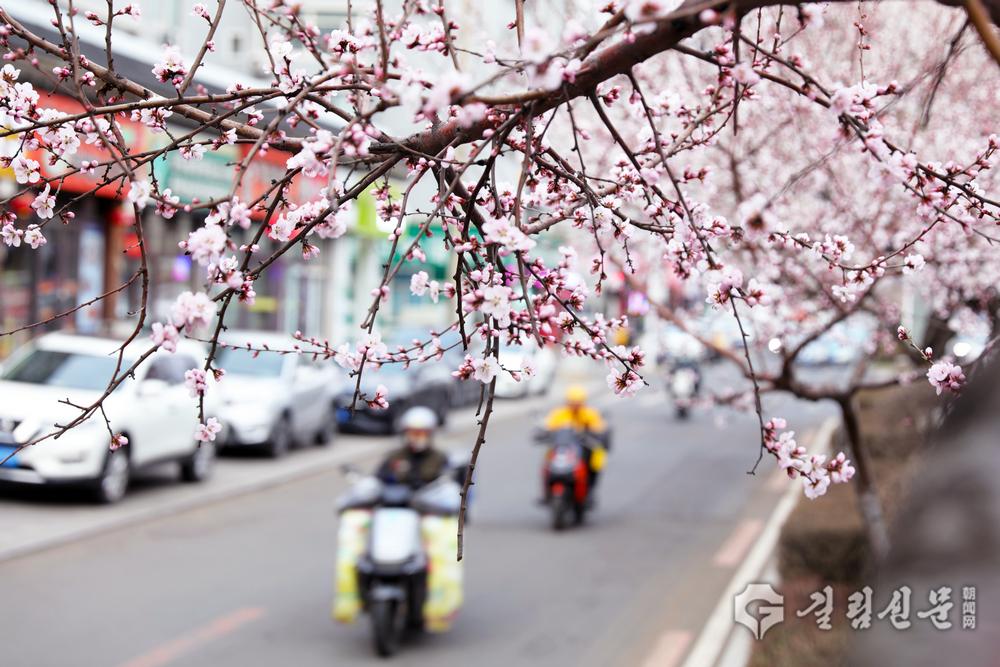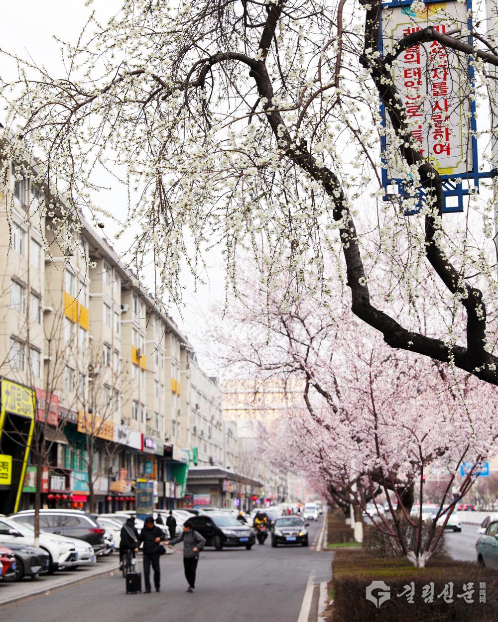연길의 봄은 장백산로에서 망울 터치는 살구꽃, 복숭아꽃 등 봄꽃들의 화사한 향연으로부터 시작된다. 사진은 4월 9일 오후, 장백산로에서 렌즈에 담은 연길의 봄풍경. /김파기자