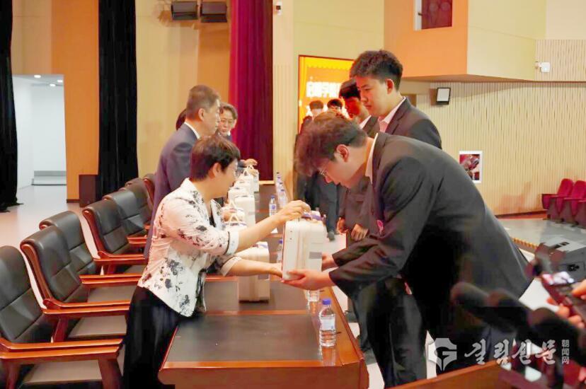 중한 두 학교 지도부에서 신입생 대표들에게 기념품을 전달하고 있다