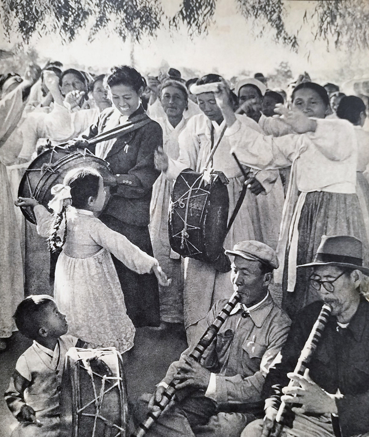 나를 본 녀선생님은 빙긋 웃으며 손짓으로 들어오라 하셨다. 나는 춤추기를 좋아했지만 쑥스러움도 있었다. 그래도 용기를 내여 둥그런 원 안으로 들어섰다. 두 팔을 벌려 장단에 맞춰 폴짝폴짝 뛰며 춤을 추기 시작했다. 그러자 어디선가 사진사 아저씨가 나타나 이리저리 자리를 옮기며 카메라를 들이댔다. 춤추는 소녀와 장단 치는 소년, 북을 멘 채 환하게 웃는 녀선생님, 다리를 꼬고 앉아 퉁소 부는 할아버지, 흰 수건을 두르고 하얀 치마저고리를 입고 장단 치는 할머니... 모두의 얼굴에 웃음꽃이 활짝 피였다. 그 아름다운 력사의 순간이 사진사의 카메라에 오롯이 담겼다.