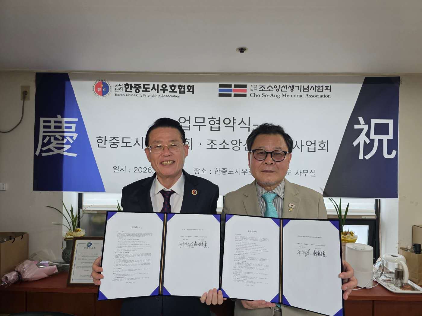 한국 한중도시우호협회(회장 권기식)와 조소앙선생기념사업회(이사장 조인래)가 27일 서울 영등포구 한중도시우호협회 사무실에서 '중한 청소년 역사교육 추진을 위한 업무협약'을 체결했다.