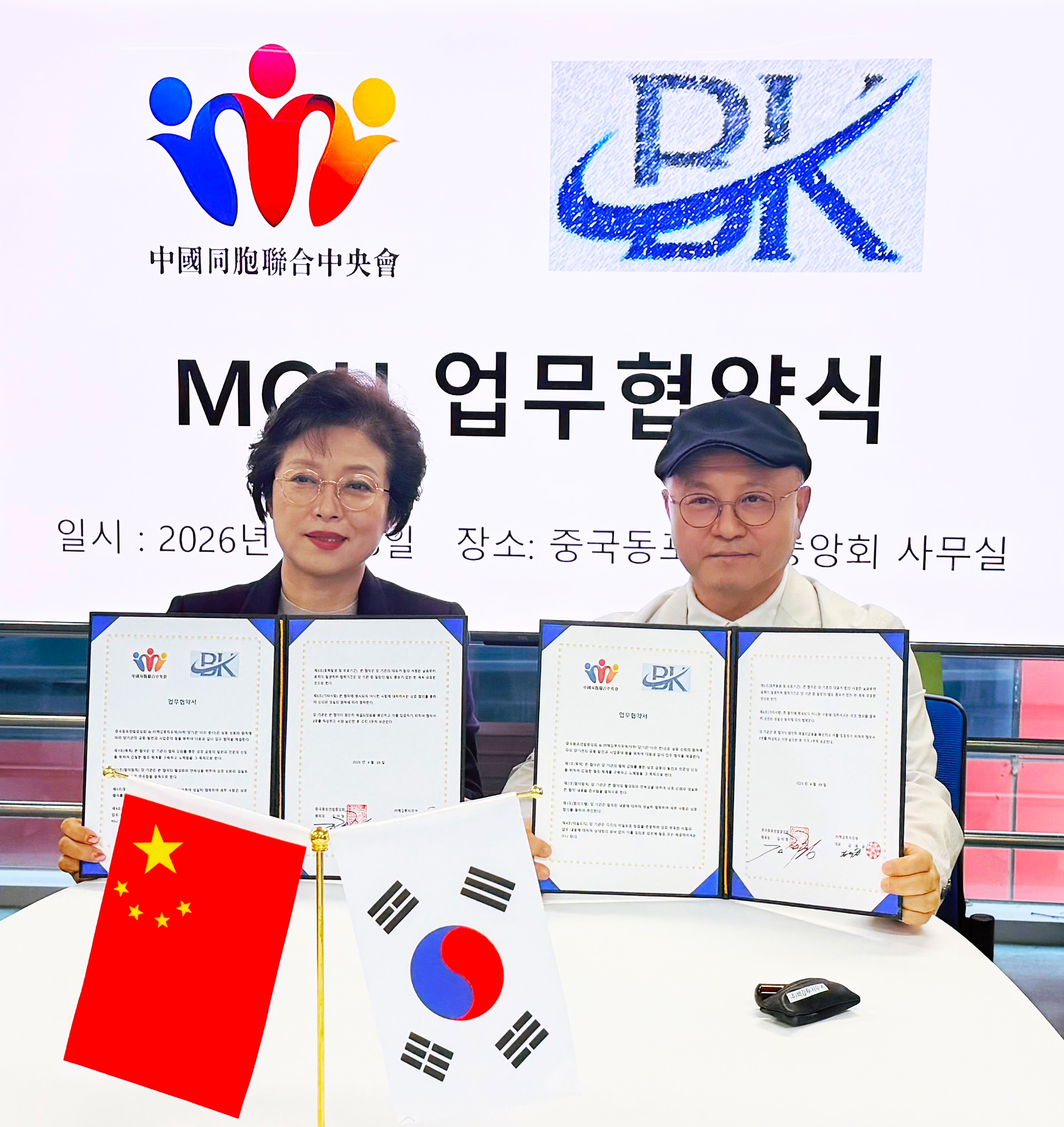 한국 법인 주식회사 백강투자무역 김재윤 대표와 중국동포연합중앙회 김미정 회장(왼쪽)가 2026년 4월 28일 전략적 업무협약(MOU)을 체결한 뒤 기념 촬영을 하고 있다.