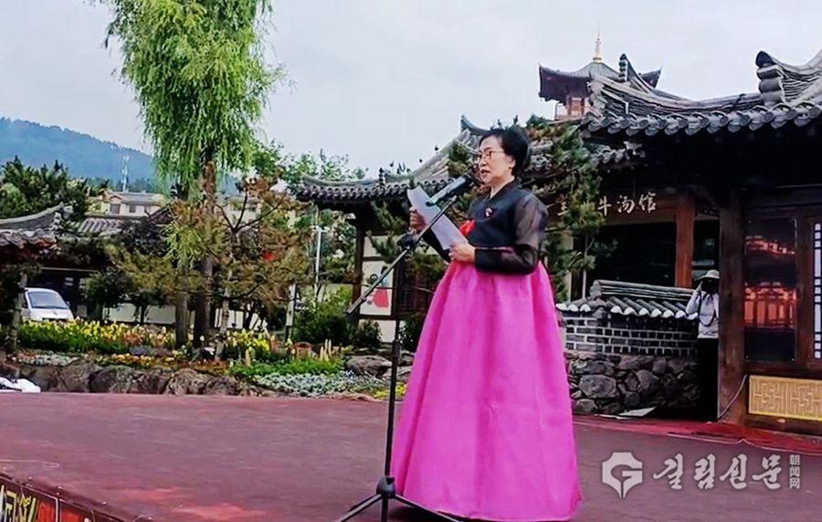 길림성조선족로년협회친목회 부회장이며 장백현조선족로인협회 회장인 김영희가 당창건 축하연설을 했다.
