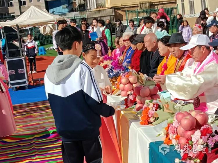 이어진 제1부 행사에서는 ‘산수연’ 경축행사가 진행되였다. 행사는 24명의 80세 이상 로인들을 주석대에 모시고 사회자가 산수연의 유래와 술을 따르고 절을 올리는 법 등 전통 례절을 상세히 설명한 뒤 학생들과 젊은이들이 정성을 다해 체험하도록 했다.