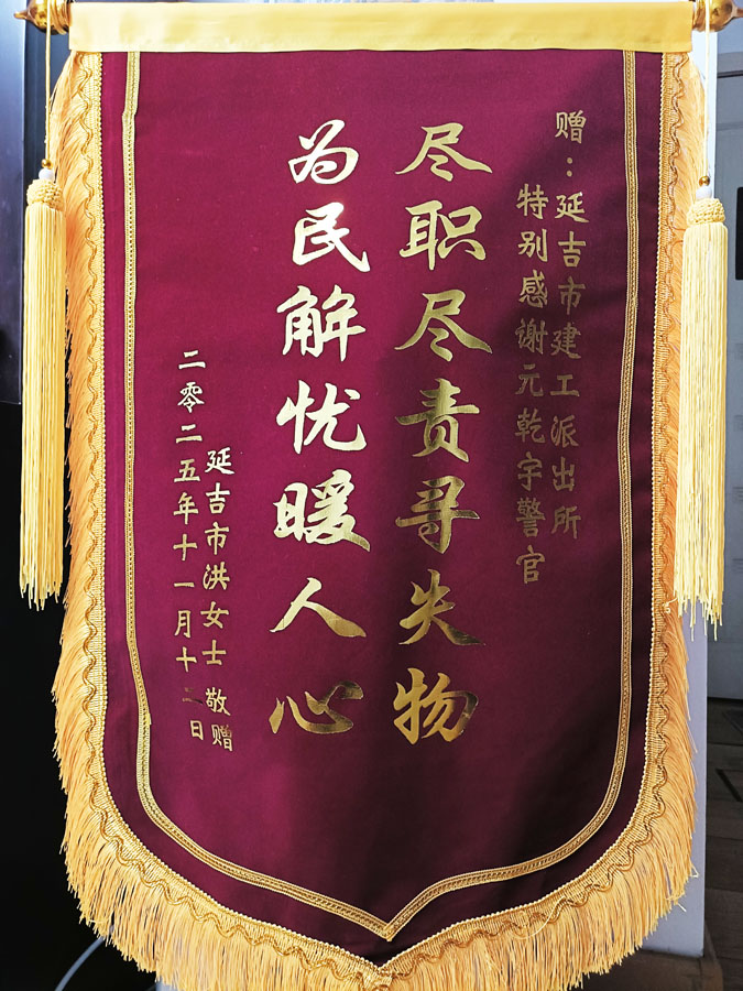 11월 14일, 홍녀사는 연길시 건공파출소에 감사기를 전달하며 경찰의 신속한 대응과 따뜻한 마음에 깊은 감사를 표했다. 홍녀사는 “핸드폰에 많은 정보를 담고 있는 요즘, 전화를 분실하면 모든 데이터를 잃게 되는 상황인데 어려움을 겪는 대중을 위해 적극 나서는 경찰들이 있어 안심된다.”고 말했다.