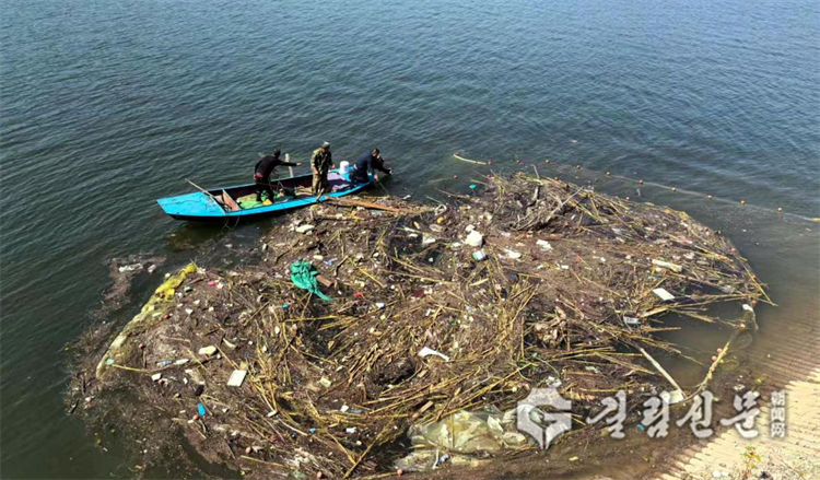 압록강변에서 쓰레기를 처리하고 있는 위사하진의 사업일군들