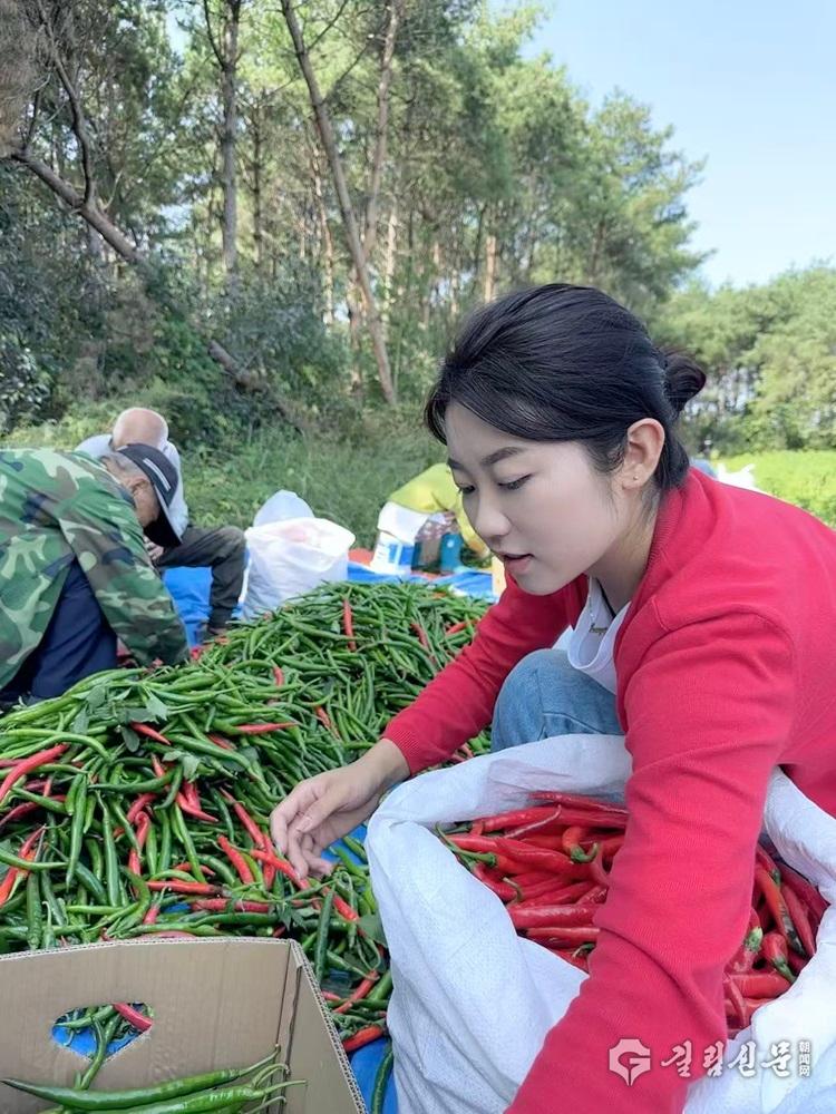고추 수확철에 촌민들과 함께 밭에서 일하는 손가정