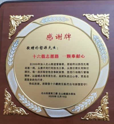 지난해말, 연길시 북산가두에서 박철원에게 증정한 감사패