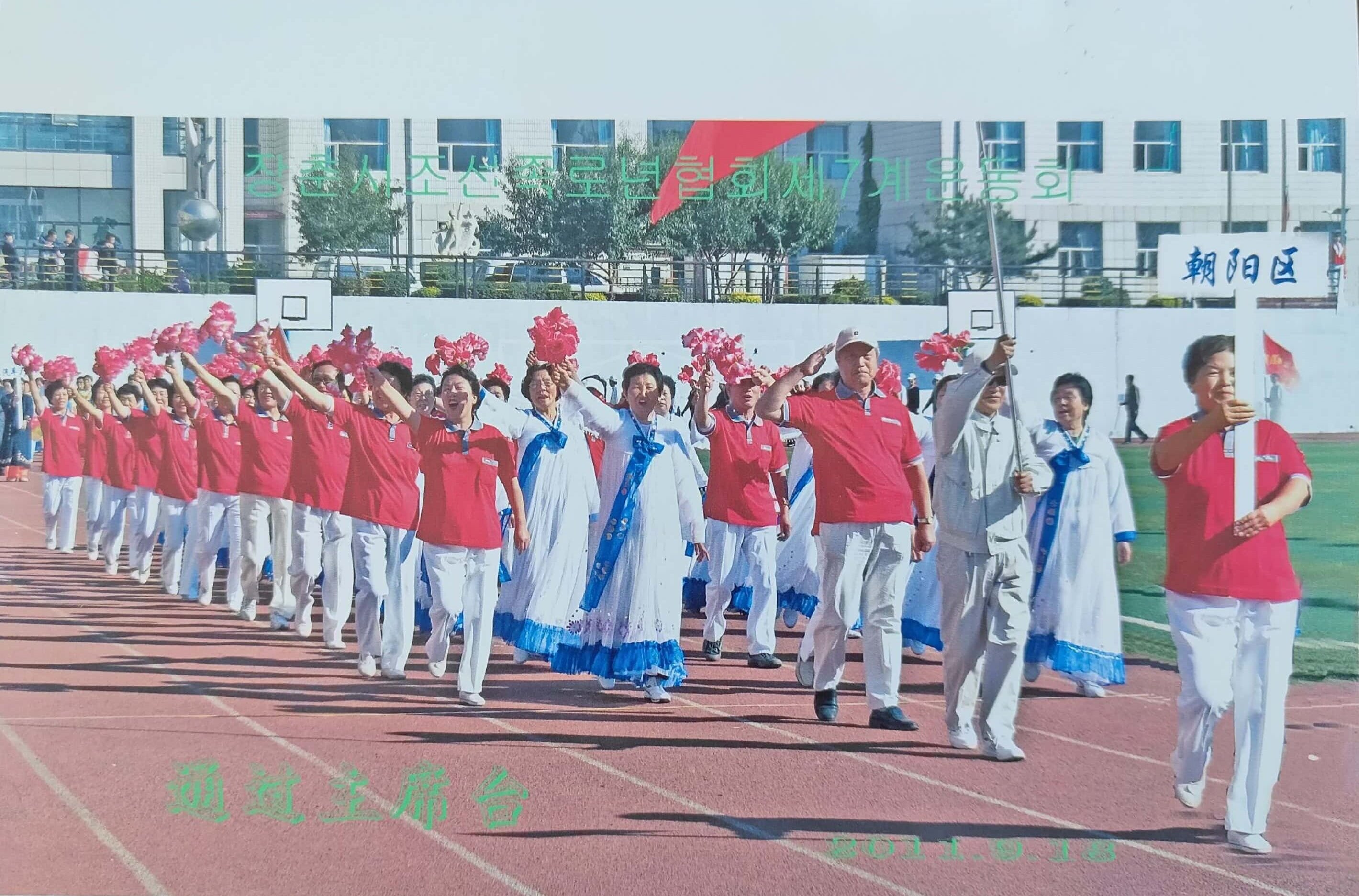 2011년, 장춘시조선족로인협회 제7기 운동회에서 조양구조선족로인협회 선수단이 주석단 앞을 지나고 있다.