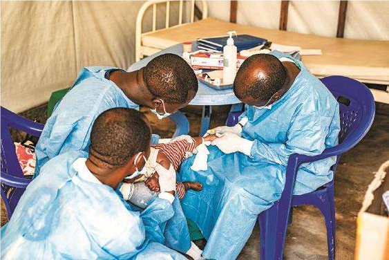 8월 15일, 꽁고(킨) 북키오주 수부 고마시 부근 니라곤고지역의 한 병원에서 의료일군이 원숭이두창 바이러스에 감염된 아동을 치료하고 있다. /신화넷
