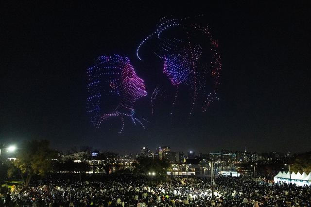 이날 한강공원에서는 드론 불빛쇼가 열렸다. 1,000대 드론이 류동적인 편대를 구성해 나비와 로케트 등 독창적인 빛 조형을 선보인 이 불빛쇼는 올해 서울 야간 문화 행사중 첨단기술을 가장 생생히 체감할 수 있는 행사였다.