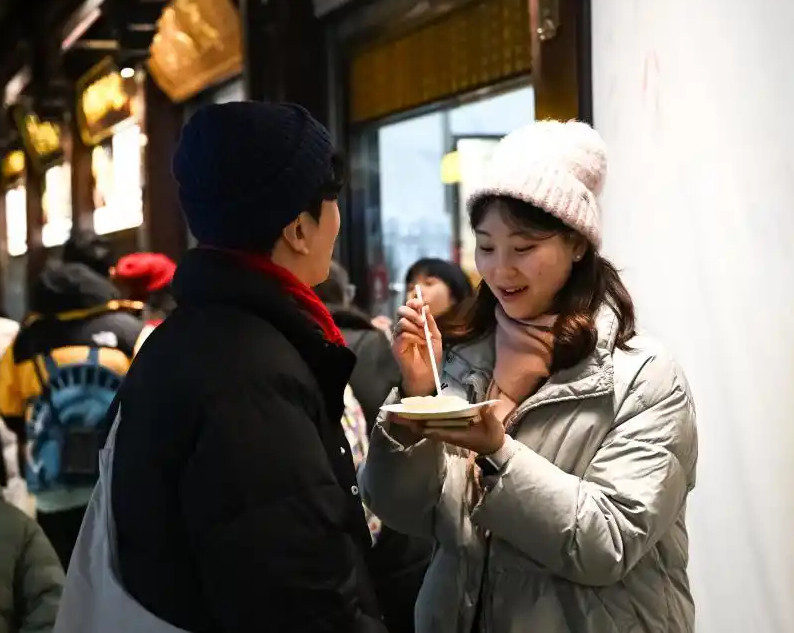 한국 관광객들이 상해 예원상점에서 특색 음식을 맛보고 있다. /신화넷