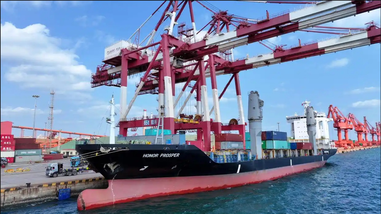 2025년 10월 29일, 한국 인천항으로 직항하는 ‘범오승오보선’(泛奥升奥普轮)이 청도항 전만(前湾)부두에서 컨테이너를 선적하고 있다. /신화넷