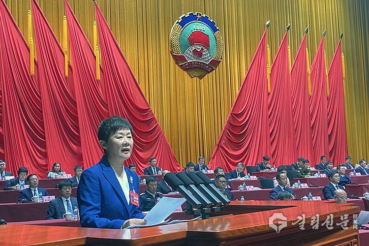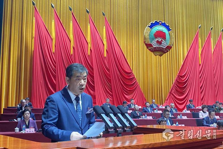 강방이 정협 연변조선족자치주 제14기 위원회 상무위원회의 위탁을 받고 대회에 제 14기 위원회 상무위원회 사업보고를 진술하는 장면