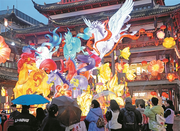 상해: 1월 26일, 예원상업중심에서 관광객들이 말해를 주제로 한 ‘준마구주, 보보생화’(骏驰九州,步步生花) 등롱을 구경하고 있다. 이날 밤 2026 상해 예원민속예술등회가 정식 시작되였다.