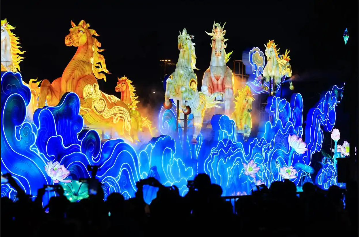 광주: 1월 30일, ‘만마분등’(万马奔腾) 등롱이 전시된 2026 광주 설맞이 등불축제가 월수공원에서 개막되였다.