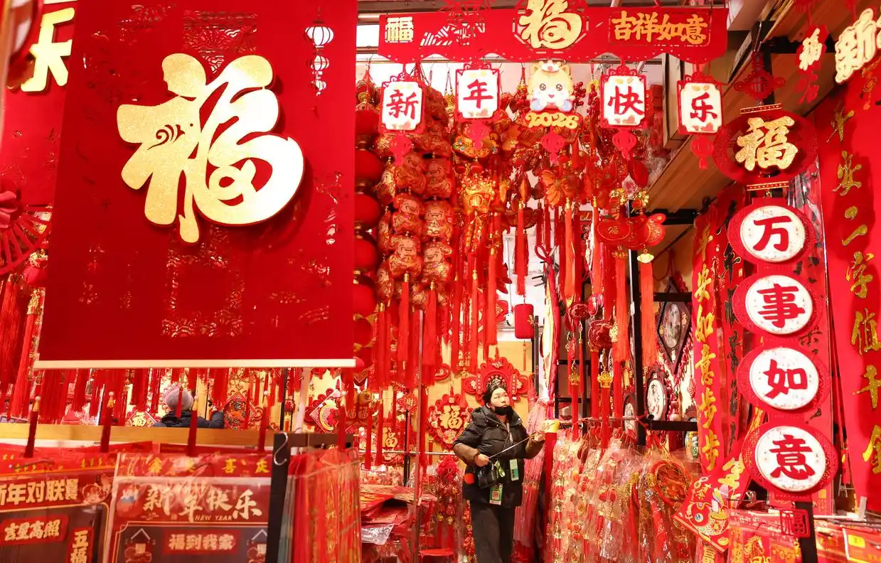 1월 28일, 하북성 석가장시 남삼조 음력설도매시장에서 점원이 설 장식품을 정리하고 있다. 음력설이 다가오면서 각지 시장이 북적이고 많은 시민들이 설 준비로 분주한 모습이다.