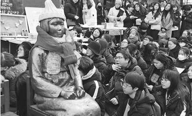 한국 수도 서울의 일본군 ‘위안부’ 피해자 상징 ‘평화의 소녀상’ 주변에서 시민들이 항의 시위를 벌이고 있다. /인민일보