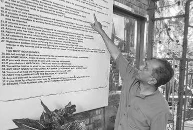 말레이시아 페낭(槟城)전쟁박물관 설립자 조하리가 안내판 앞에서 일본군이 페낭 점령후 발표한 ‘38개 엄명’을 소개하고 있다. /인민일보