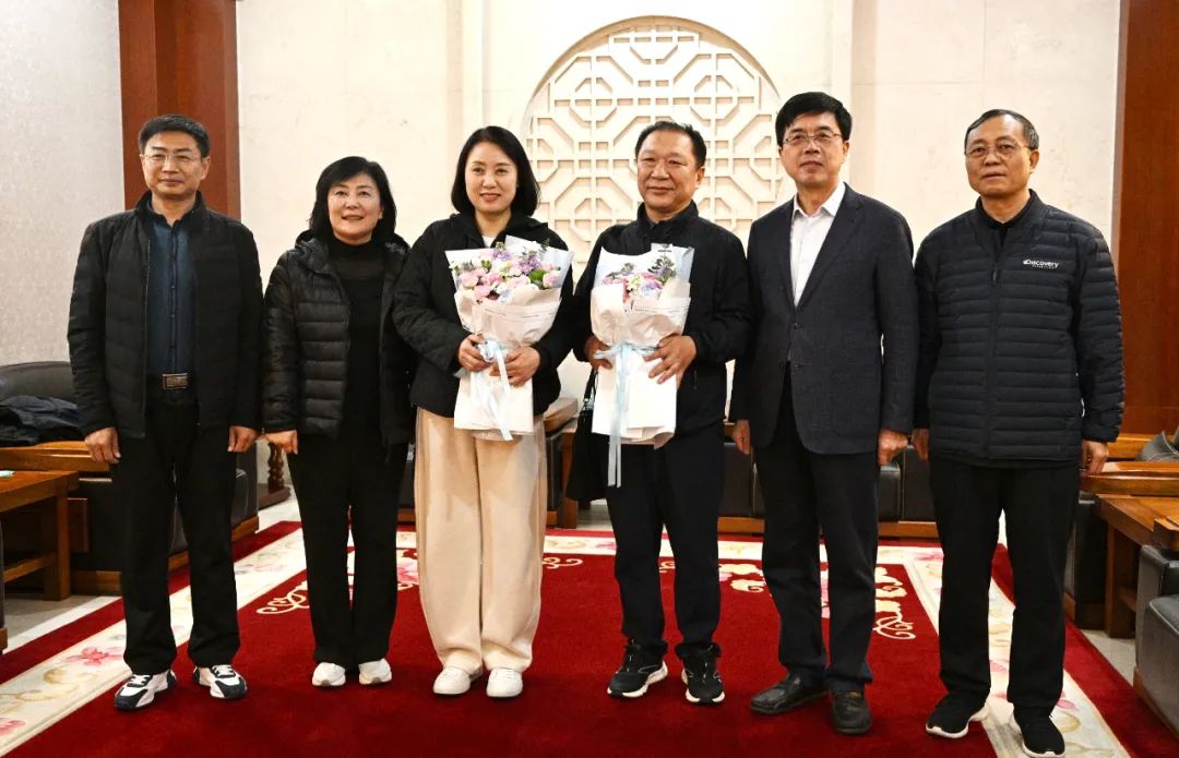 연변조선족자치주당위 상무위원이며 선전부 부장인 김기덕(오른쪽 두번째)이 영예를 안고 귀향한 김영건 정봉숙 등 작가일행을 맞이하였다./사진 강내함