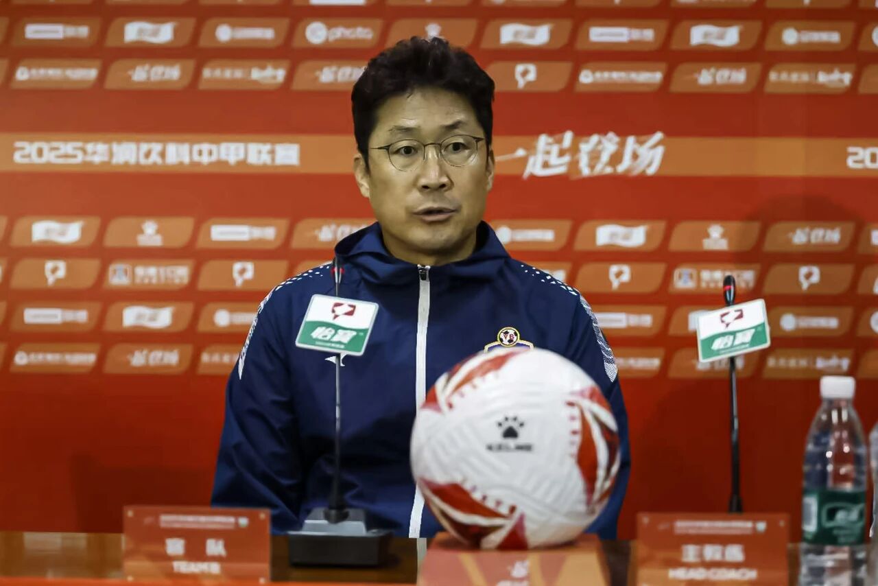 경기후 소식공개회에 참가한 이기형 감독. /사진 연변룡정축구구락부