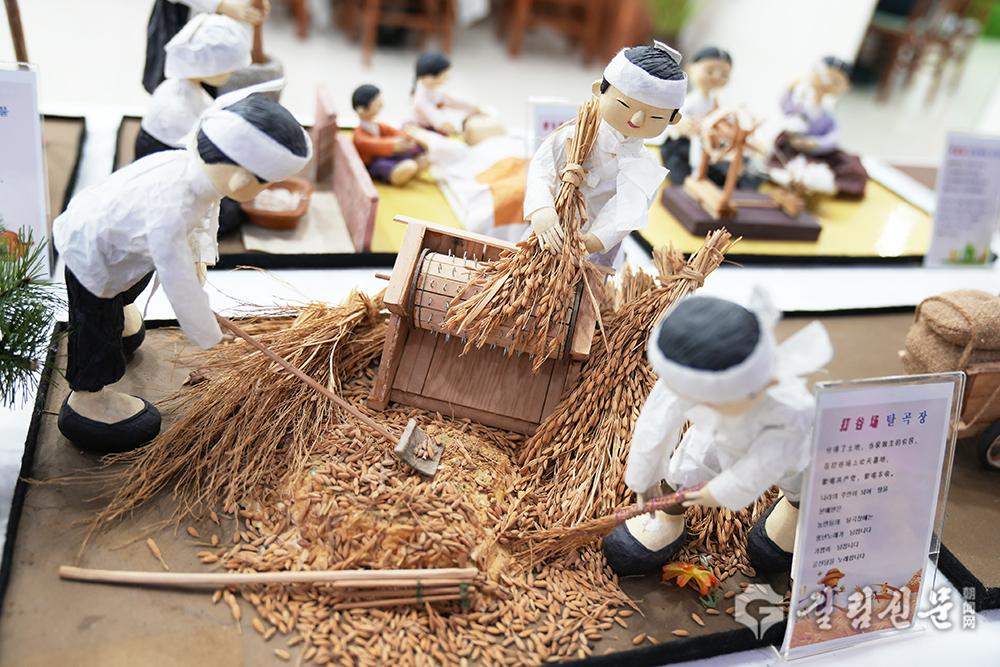 〈흘러간 세월을 뒤돌아보며〉 에 전시된 작품들은 중국조선족의 이주, 개척, 교육, 항일 투쟁, 자치주 창립, 개혁개방 이후의 변화 등 중요한 역사적 순간들을 세밀하게 재현하고 있었다. ‘개척’ 장면에서는 짚으로 엮은 움막집 앞에서 땀 흘리며 황무지를 일구는 부부의 모습이 고달픔과 인내를 동시에 전한다. 배경에 더해진 엉킨 나뭇가지와 마른 풀뿌리까지 디테일하게 표현되여 당시의 고난을 생생하게 전달한다. 탈곡장면에서는 실제 벼이삭과 벼알을 사용해 진실감과 현장감을 극대화했다.