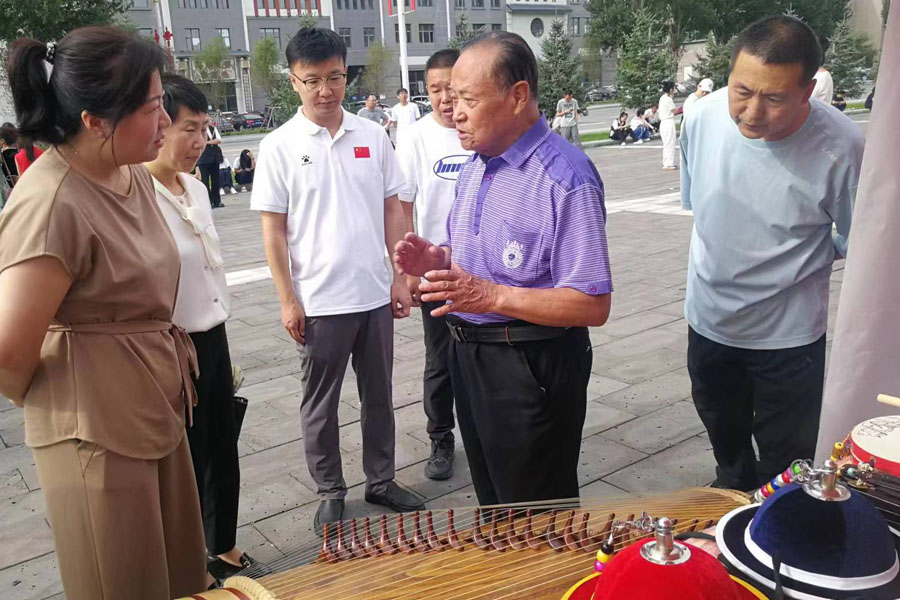 길림성중화민족공동체의식 확고히 수립 주제 문화 기층 내려가기 계렬행사에서 조선족악기에 대해 소개하고있는 조기덕 소장