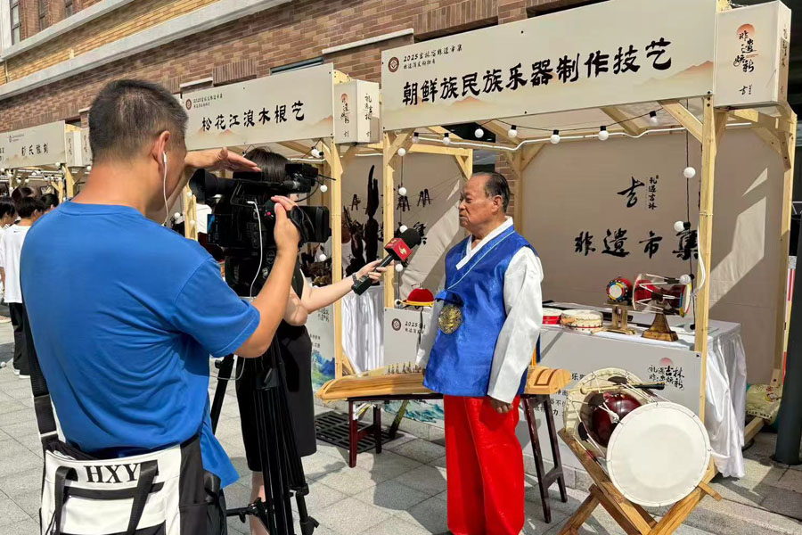 지난 8월에 소집된 길림성무형문화유산장터 행사에서 매체의 취재를 받고있는 조기덕 소장