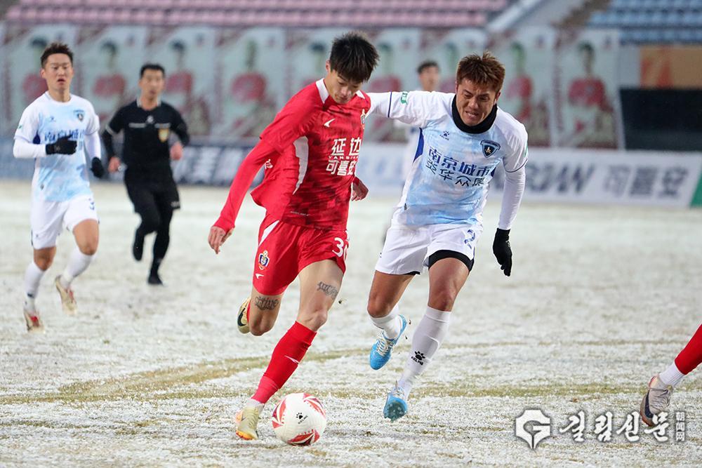 이날 연길에 을씨년스럽게 눈비가 내리면서 눈밭에서 시작된 경기는 두 팀의 탐색전으로 서로의 분위기를 엿봤다.