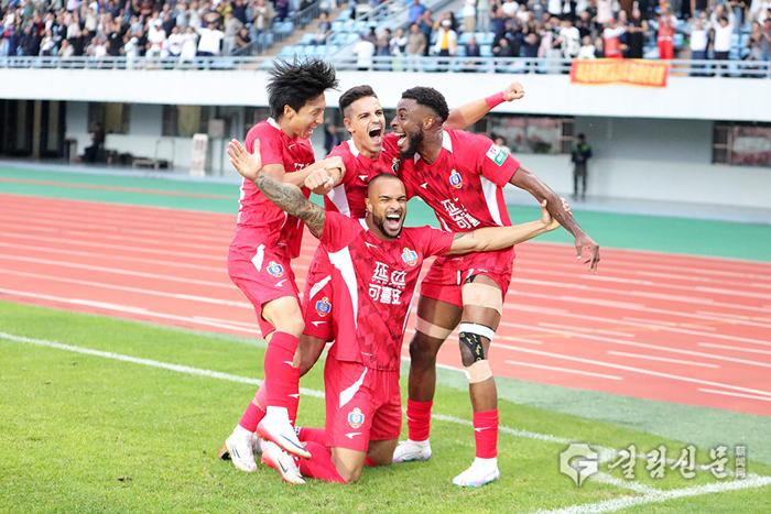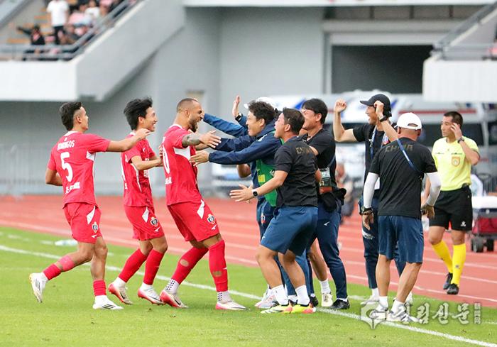선제꼴을 뽑은 포부스가 감독진과 함께 자축하고 있다.(사진 김파 기자)
