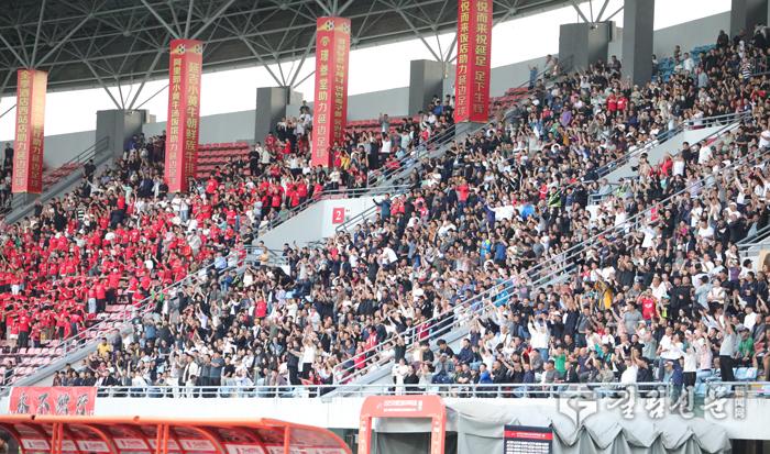 연길시전민건강중심체육장을 찾아 연변팀을 응원하는 축구팬들.(사진 김파 기자)
