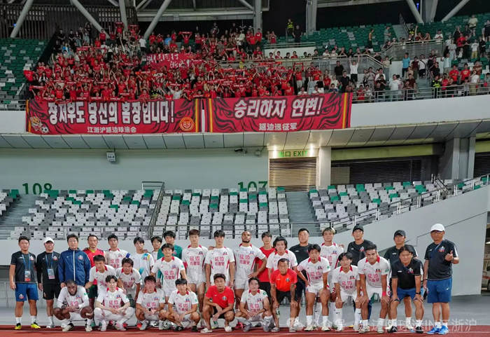 대 소주전이 끝난 후 연변팀 선수들과 연변팀쟝저후축구팬들이 사진을 남기고 있다.(자료 사진)